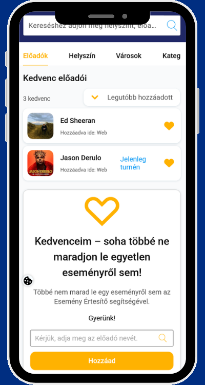 Tudta? Saját kedvencek listát hozhat létre, ha megjelöli a számára legkedvesebb előadókat, kategóriákat, rendezvényhelyszíneket és helyeket.