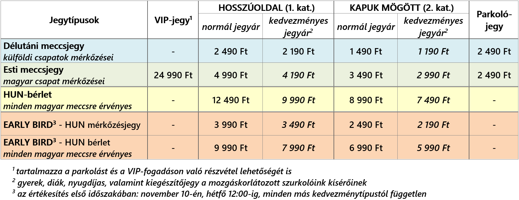 - EARLY BIRD HUN meccsjegy az 1. kategóriában: 3 990 Ft, kedvezményesen 3 490 Ft,